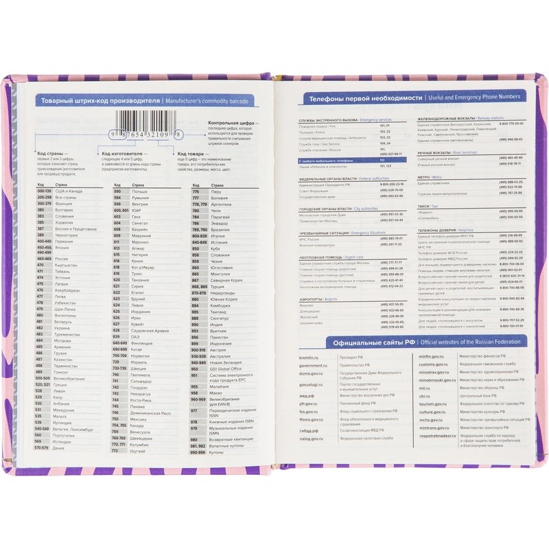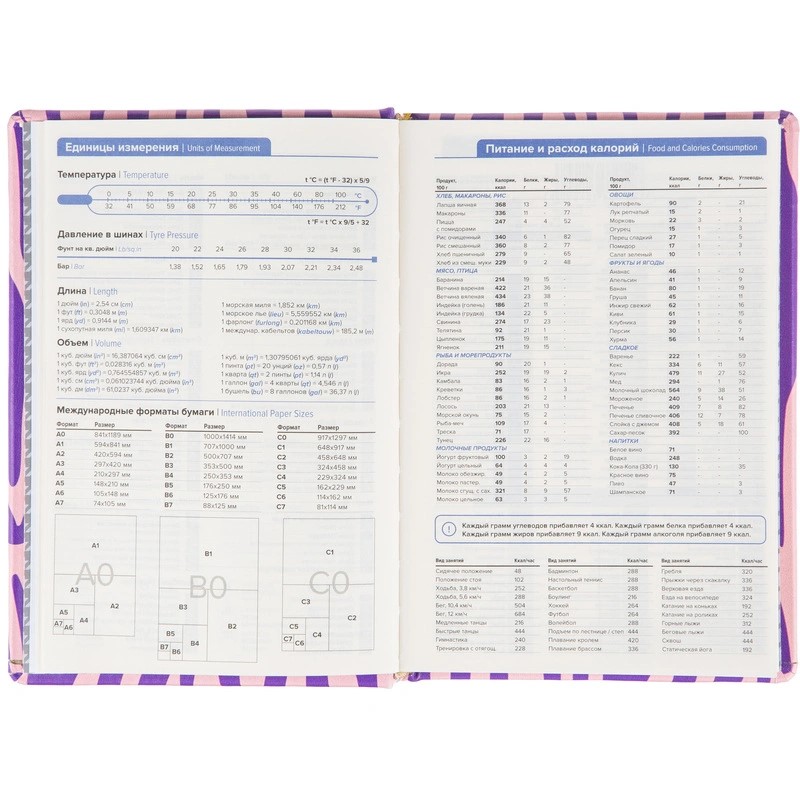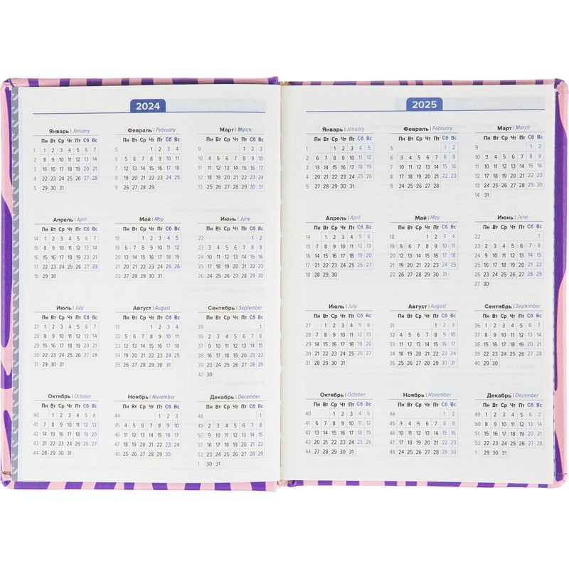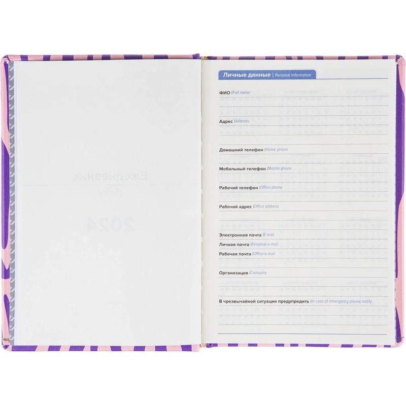 Внутренний блок состоит из 160 листов тонированной офсетной бумаги плотностью 80 г/кв.м с разметкой в линейку и печатью в две краски. В блоке предусмотрен информационно-справочный раздел с праздниками России, международными телефонными кодами городов, цифровыми кодами ГИБДД, справочником неметрических единиц с переводом в метрические и таблицей размеров одежды. Также имеется алфавитный блок без вырубки. Внутри расположен календарь на 2024–2027 годы. Листы крепятся методом сшивки.