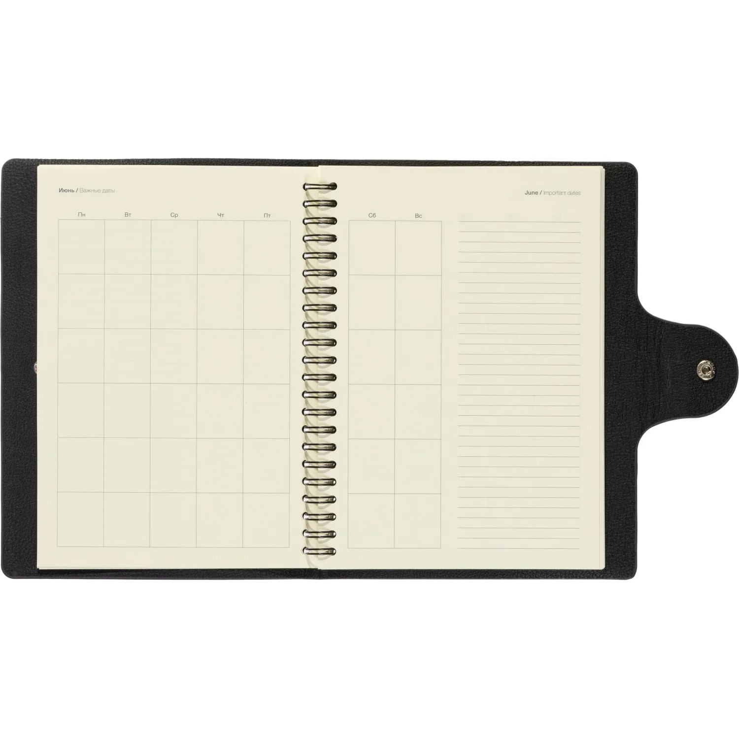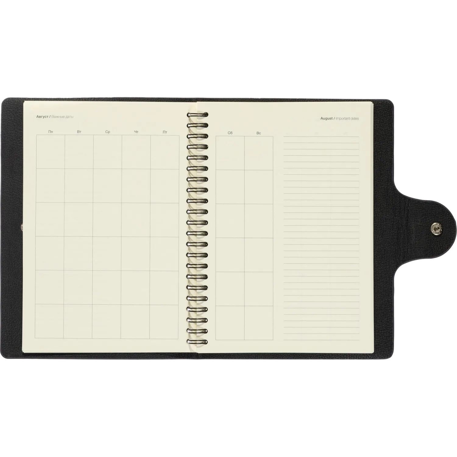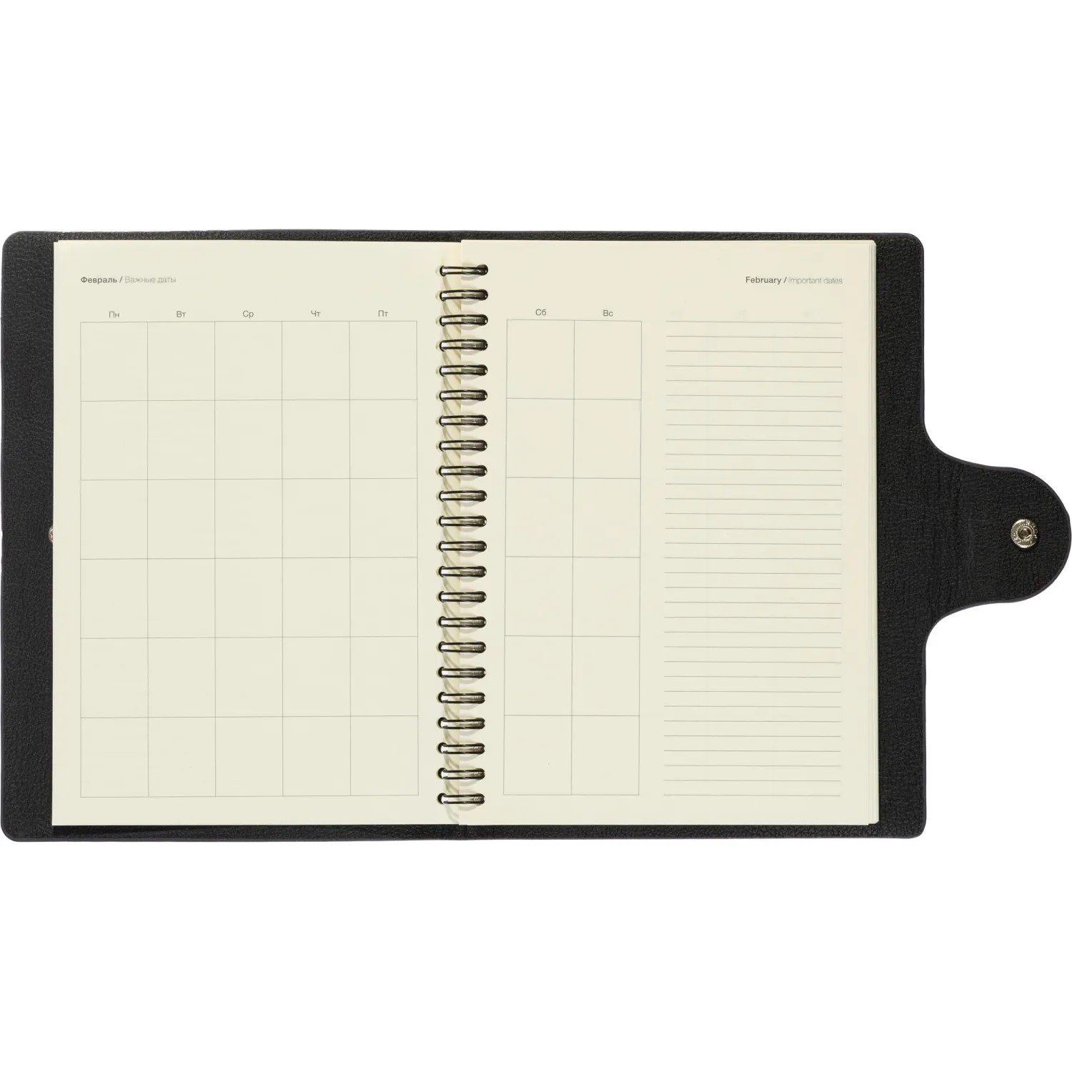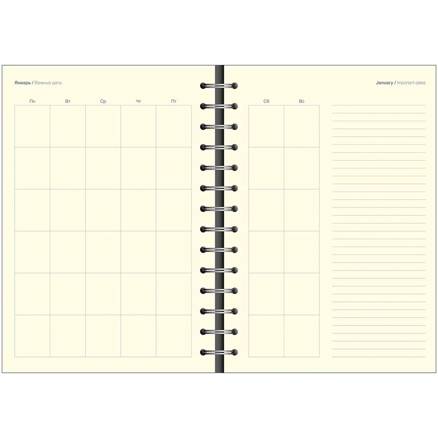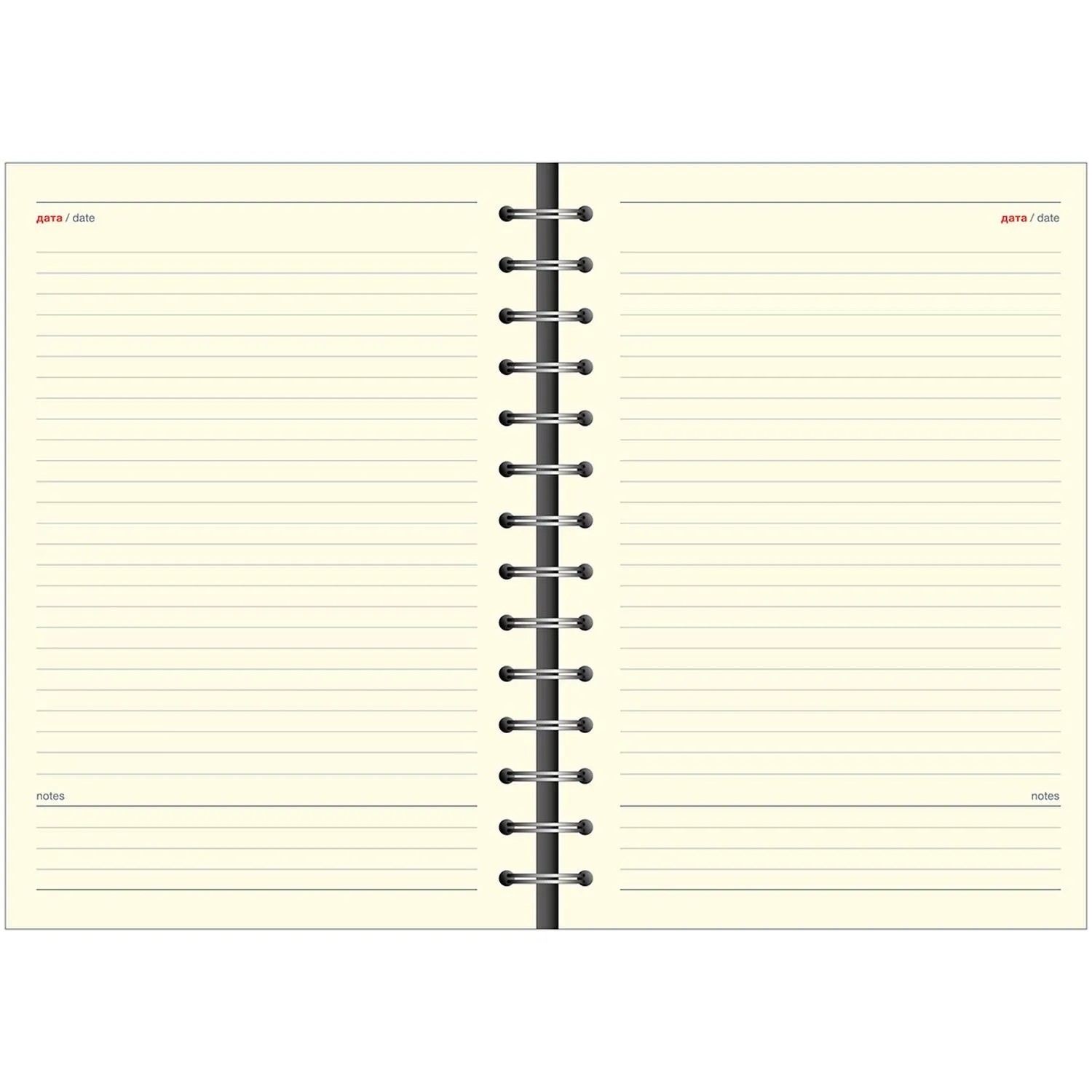 Внутренний блок состоит из 96 листов (192 страницы) высококачественной бумаги цвета слоновой кости плотностью 70-90 г/кв.м. с прямыми уголками и линовкой в линейку. В ежедневнике предусмотрен информационный блок с титульным листом, планером на каждый месяц и разворотами для заметок в начале и конце блока.