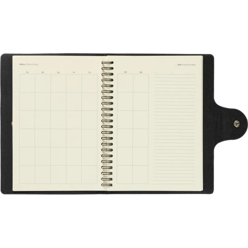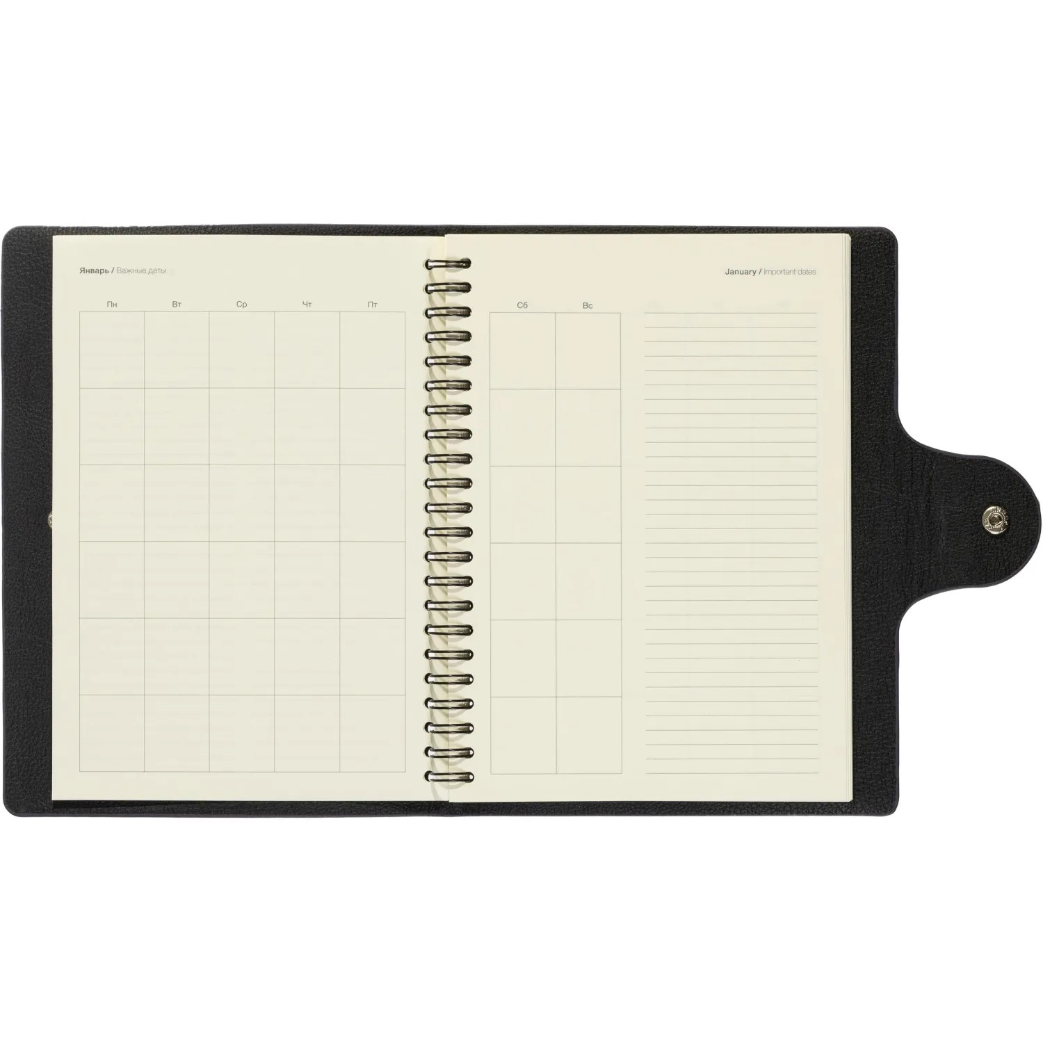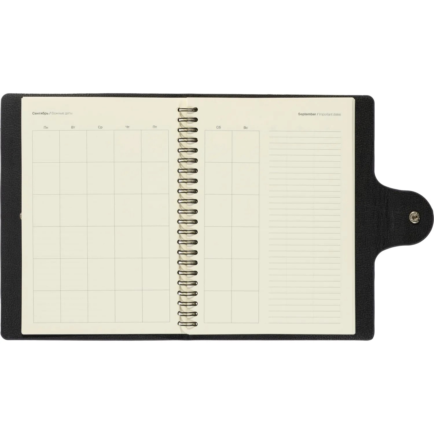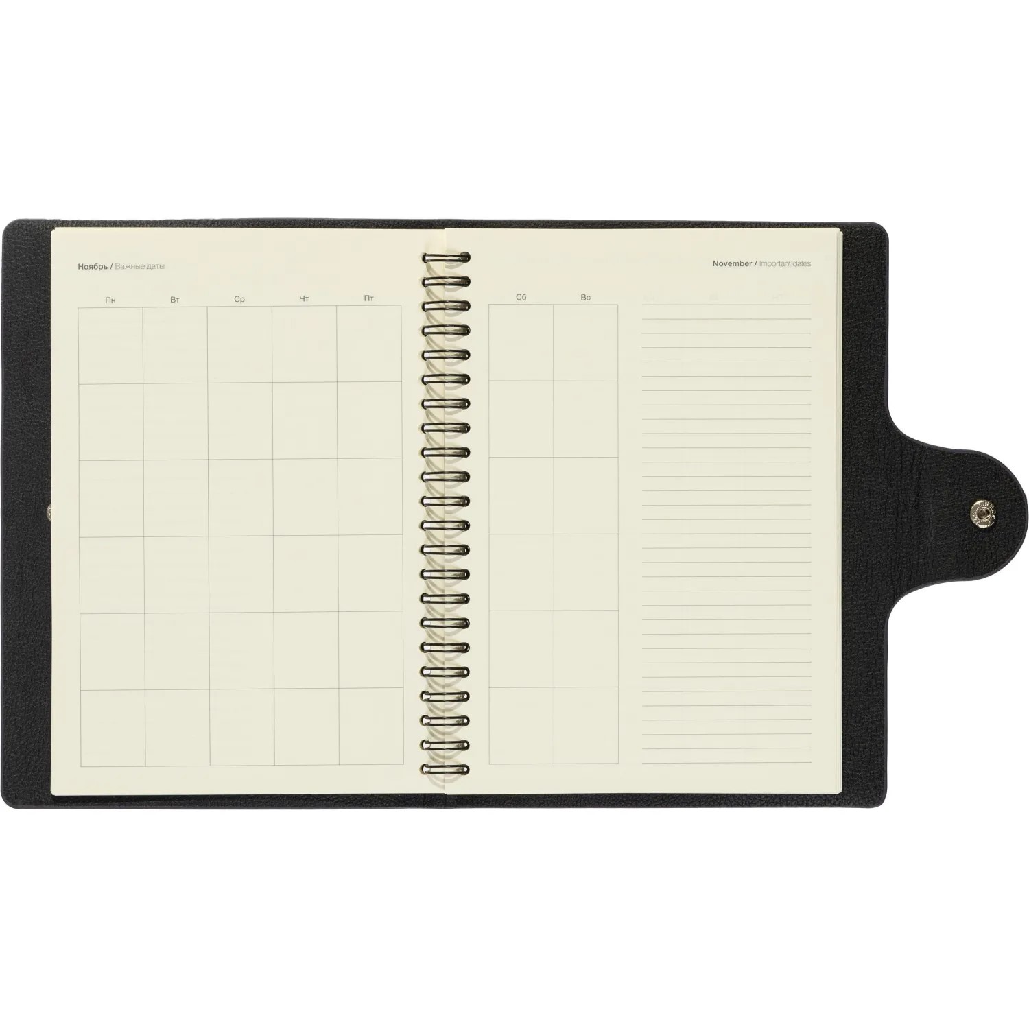 Внутренний блок состоит из 96 листов (192 страницы) высококачественной бумаги цвета слоновой кости плотностью 70-90 г/кв.м. с прямыми уголками и линовкой в линейку. В ежедневнике предусмотрен информационный блок с титульным листом, планером на каждый месяц и разворотами для заметок в начале и конце блока.
