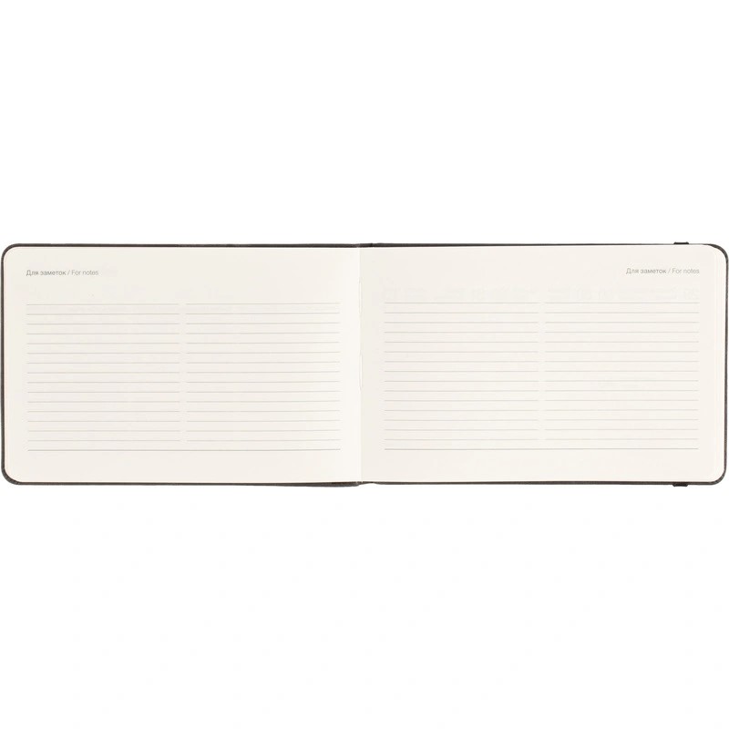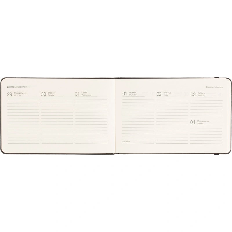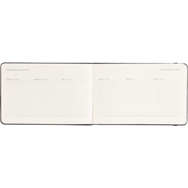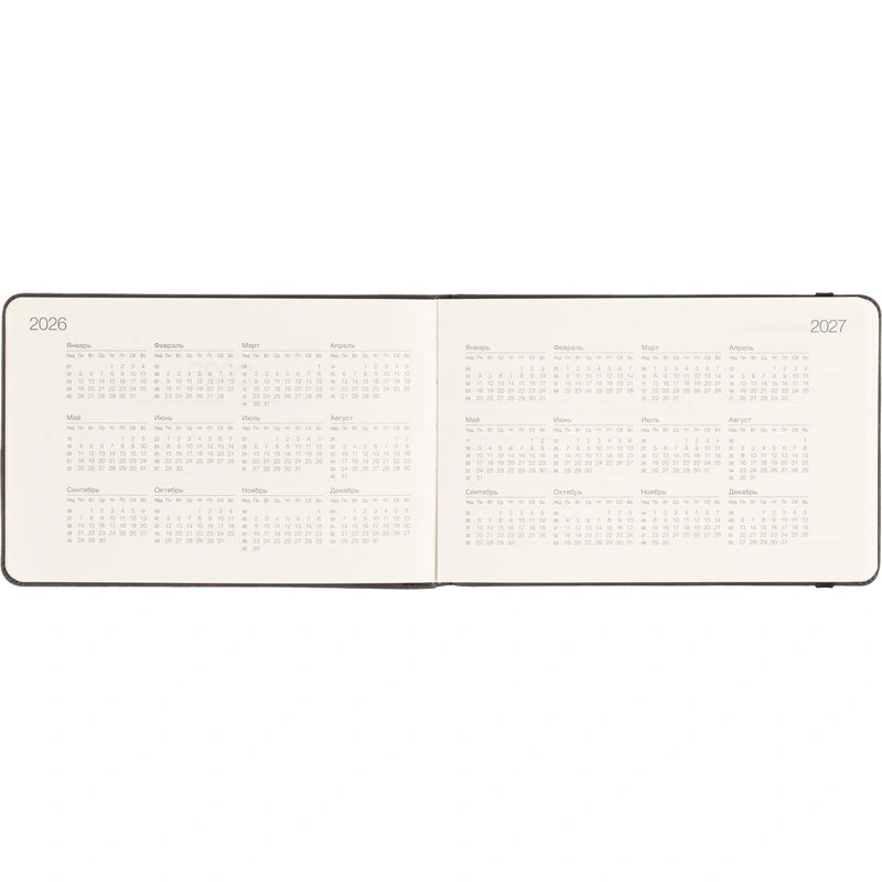 Датированный внутренний блок в линейку на 64 листа (128 страниц) из высококачественной бумаги цвета слоновой кости плотностью 70 г/кв.м. Информационный блок включает в себя: календари на 2026-2027 гг., развороты с планированием и важными датами, место для заметок.