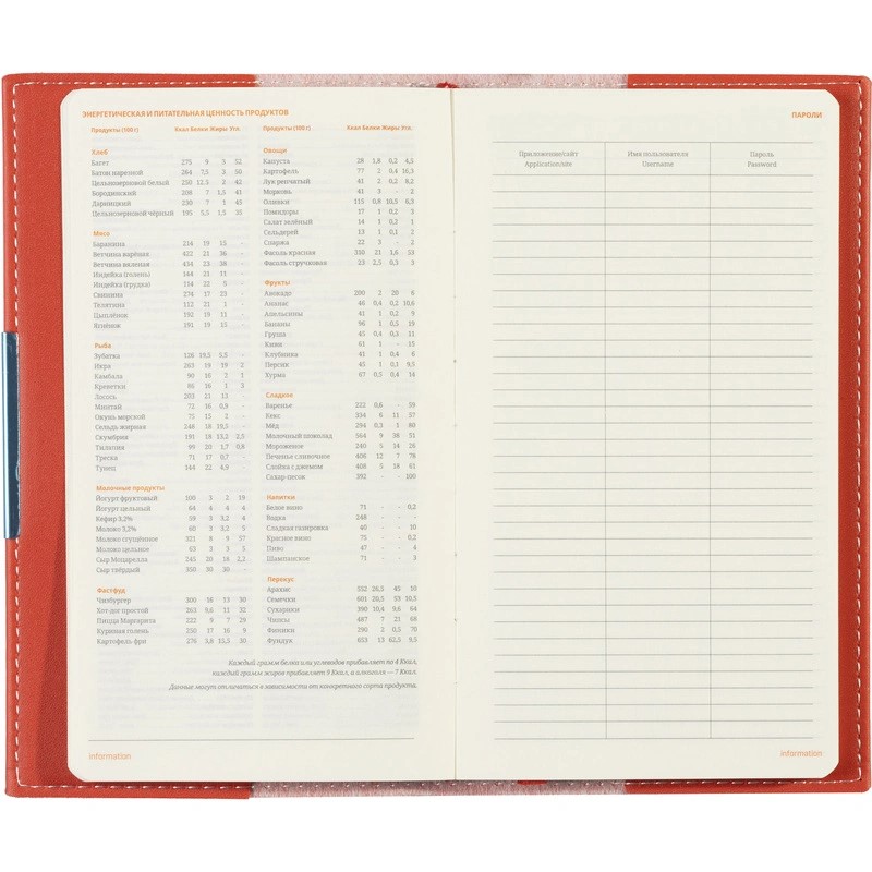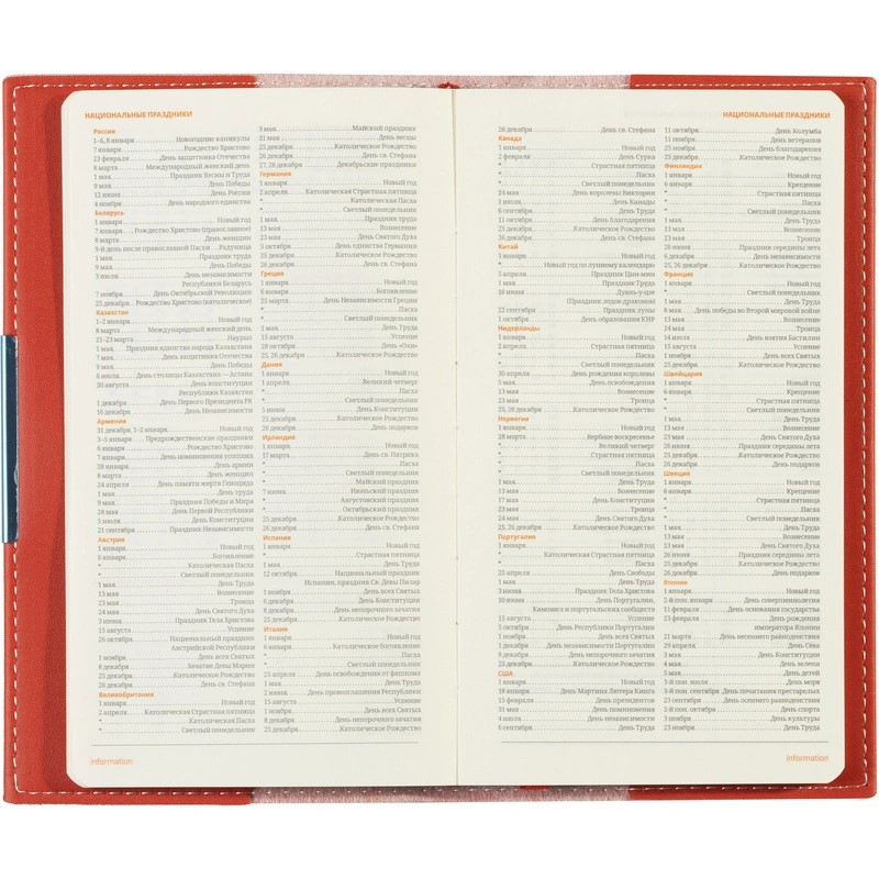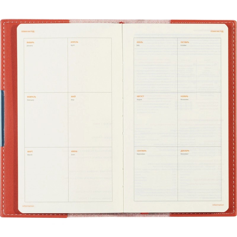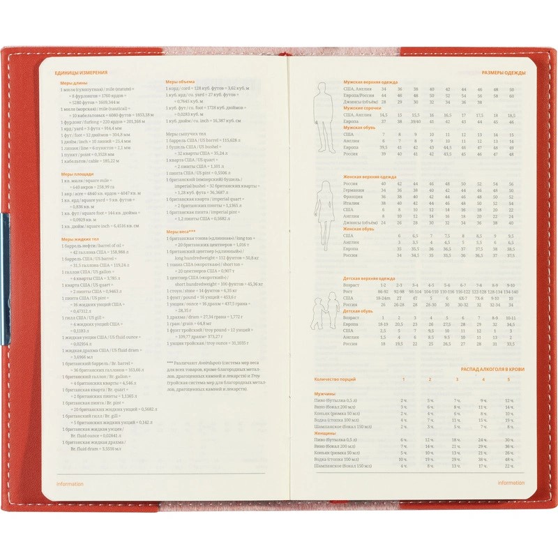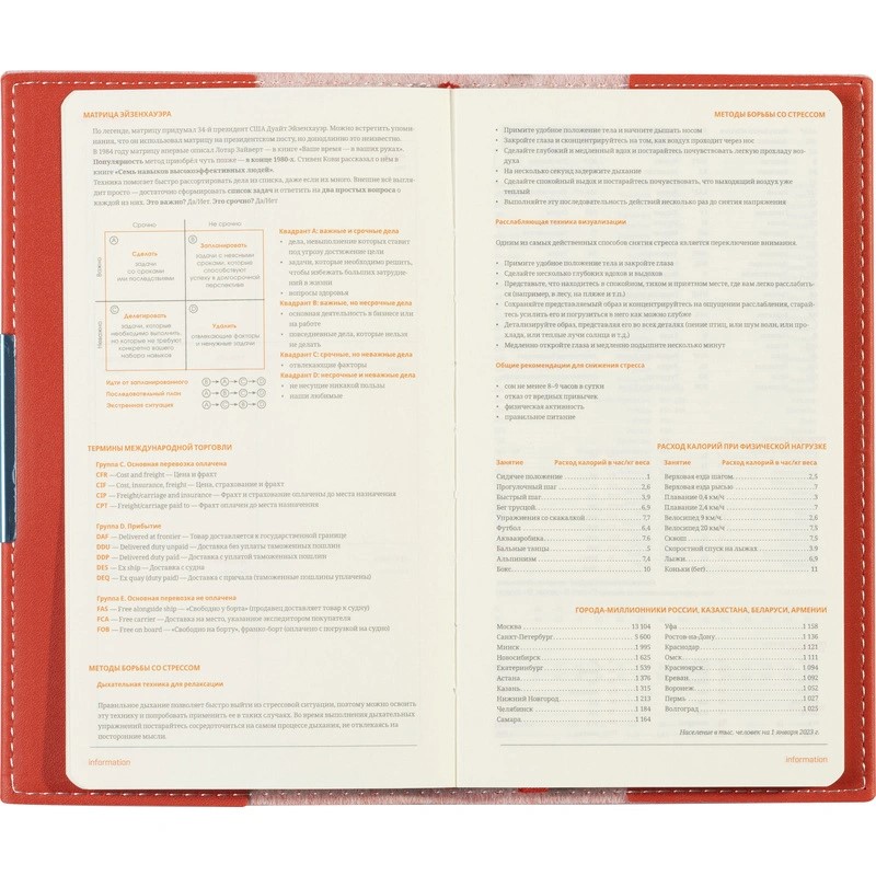 Информационно-справочный блок, размещённый на 18 страницах, является источником полезной информации, которая пригодится при ведении бизнеса. Карманный формат этого еженедельника позволяет эффективно вести записи на выездных совещаниях, переговорах и встречах.