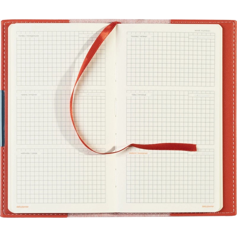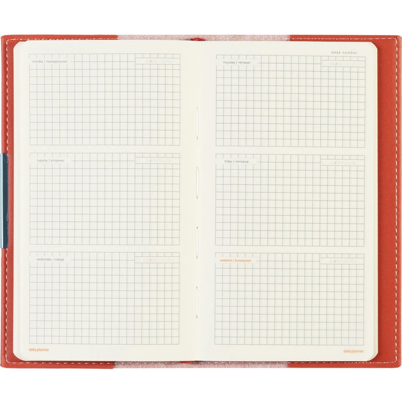 Недатированный еженедельник компактного формата A6 состоит из 160 страниц, объединённых в сменный блок. Линовка блока — клетка, с указанием дней недели. Бумага бежевого цвета обладает высшим качеством и плотностью 70-90 г/кв.м.