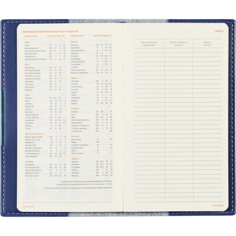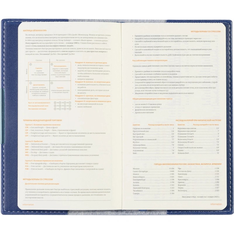 Блок состоит из 160 страниц, сделанных из бежевой бумаги плотностью 70-90 г/кв.м. На 18 первых страницах размещена справочная информация с ценными сведениями из разных областей. Линовка блока — клетка, с указанием дней недели.