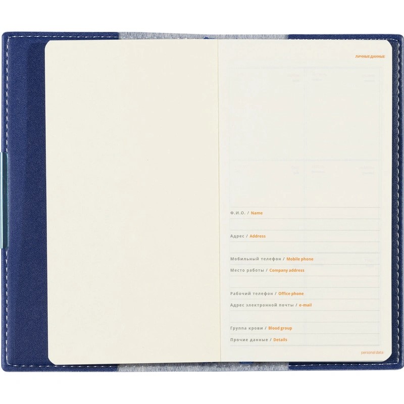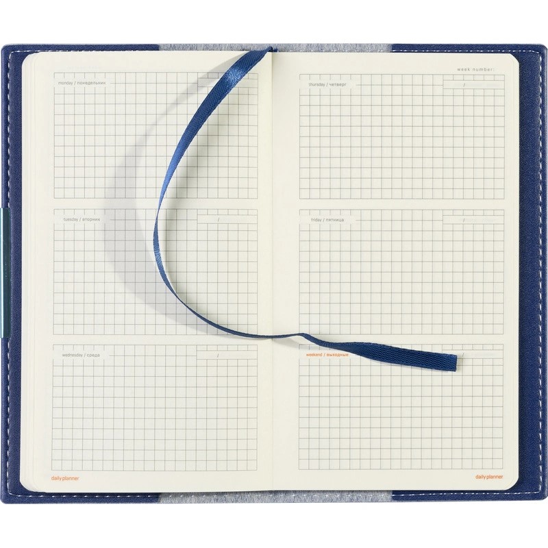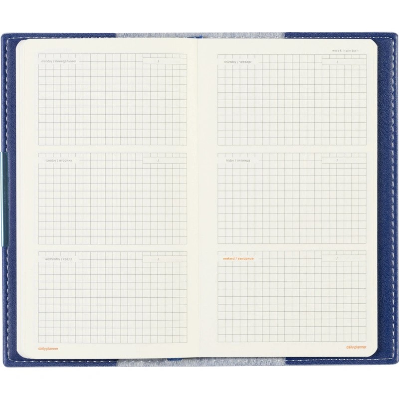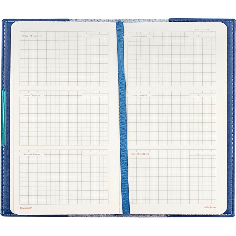Карманный формат позволяет эффективно вести записи на выездных совещаниях, переговорах и встречах. Еженедельник также подходит для персонализации.