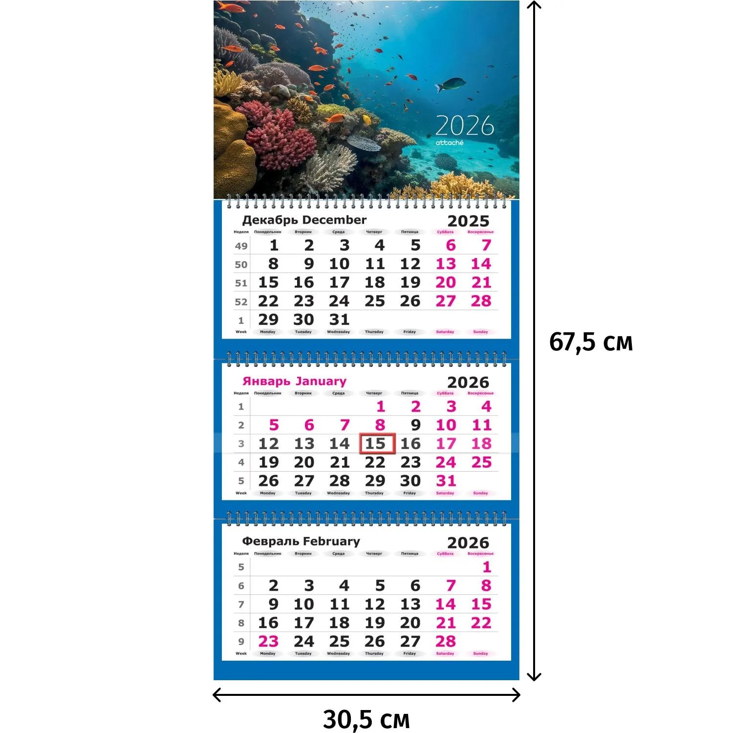 Календарь настенный квартальный 3-х блочный 2026 Рыбки 305х675мм, на спирали