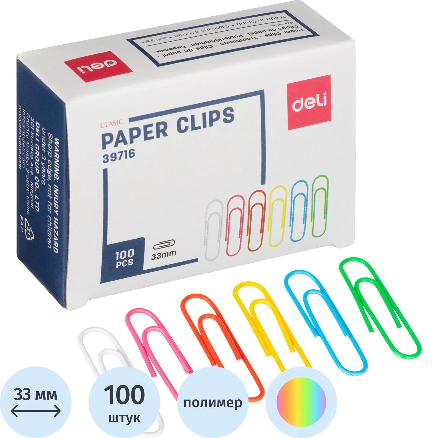 Скрепки канцелярские 33 мм металлические с полимерным покрытием цветные Deli (уп. 100 шт)