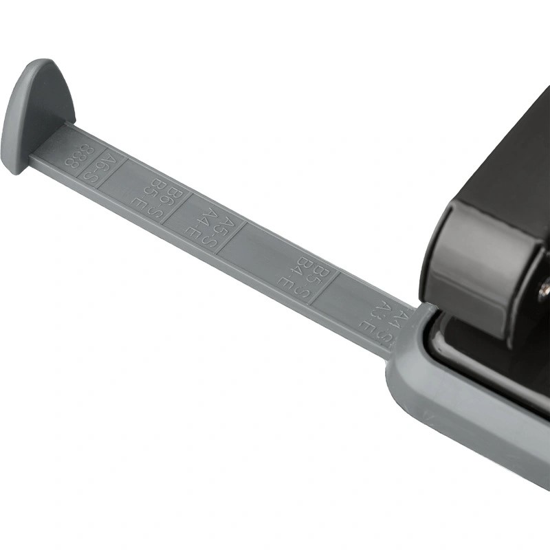 Перед началом использования необходимо снять фиксацию дырокола в сложенном виде. Для этого нужно одновременно нажать на металлическую кнопку возле основания дырокола и верхнюю часть дырокола. Точно также можно зафиксировать дырокол обратно в закрытое положение для экономии рабочего пространства и удобной перевозки. Наличие линейки A3, A4, A5, A6, B4, B5, B6 позволяет зафиксировать бумагу на нужном расстоянии, отметка на линейке 888 позволяет использовать вместо дырокола на 4 отверстия. Дырокол выполнен в металлическом черном корпусе с противоскользящей прорезиненной вставкой.