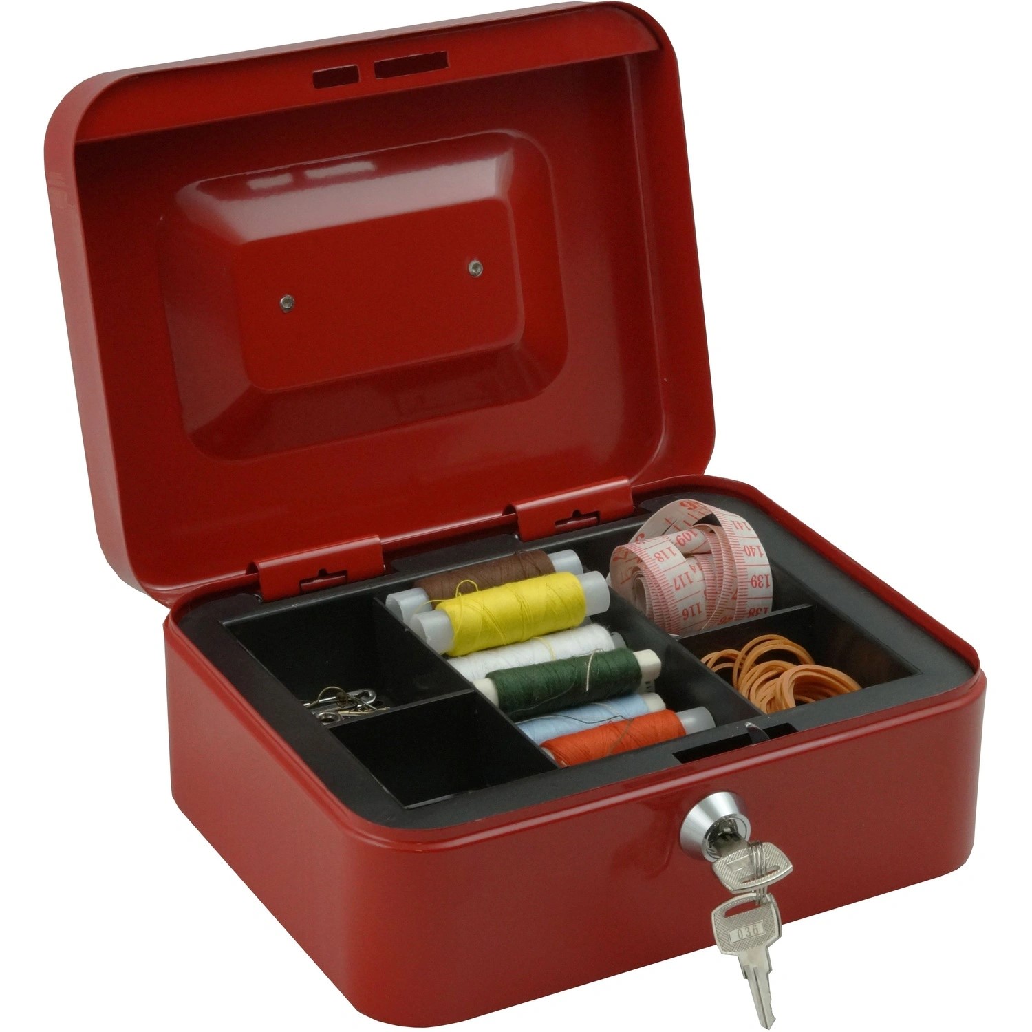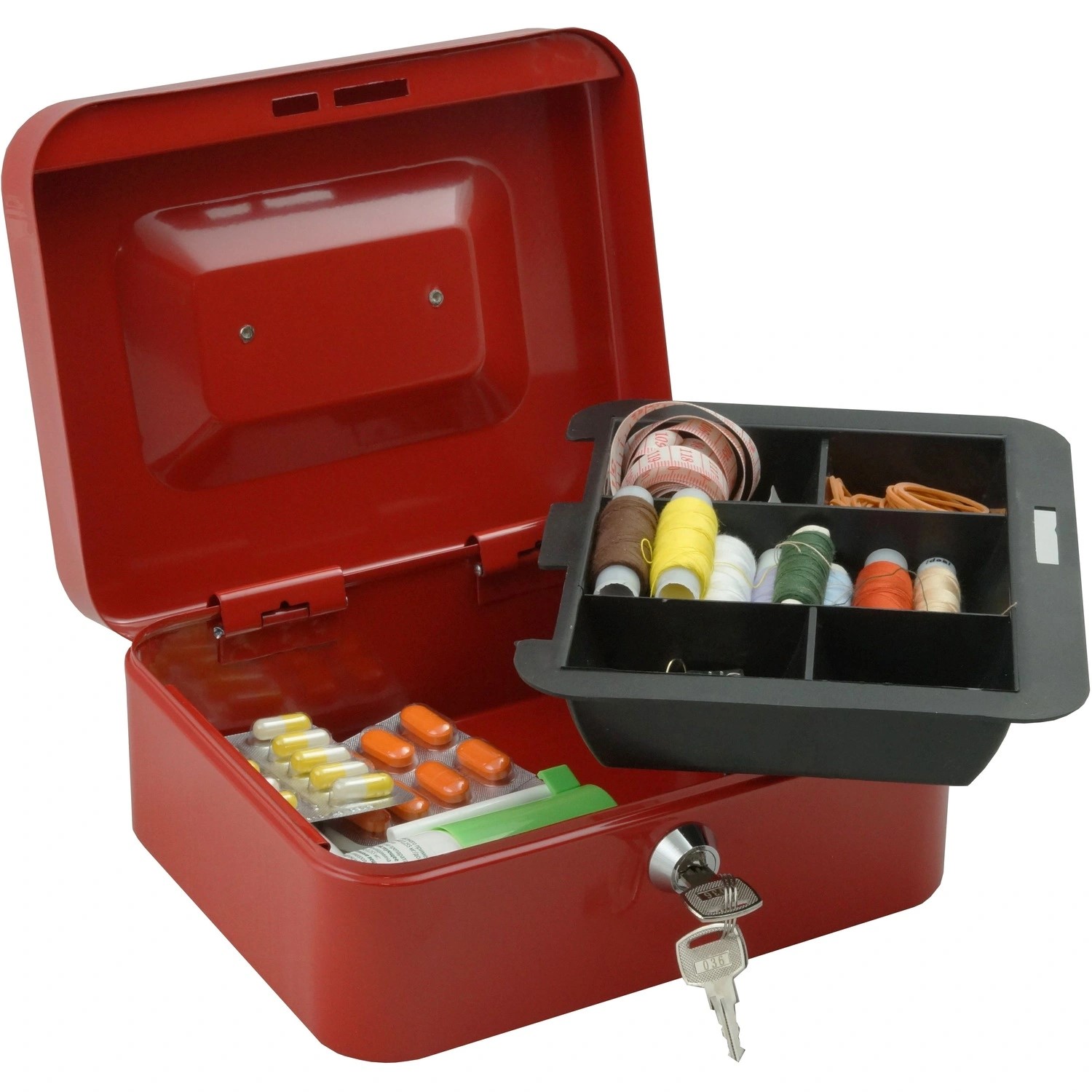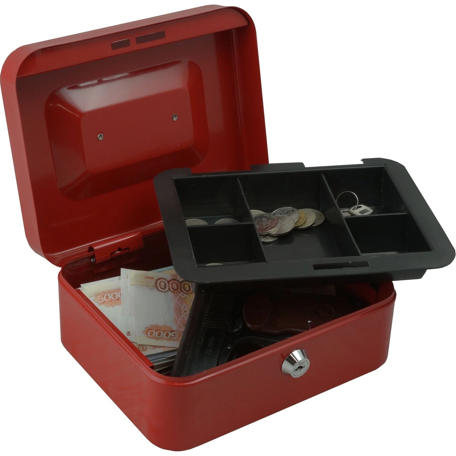 Кэшбокс Klesto, удобный переносной мини сейф для денег, который можно использовать как тайник. Легко спрятать в любой части квартиры или офиса. Прочная закрываемая на ключ переносная шкатулка с замком, для драгоценностей и денег. Для удобства транспортировки, предусмотрена удобная ручка. Для монет предусмотрен лоток для денег, выполненный из прочного пластика. Пластиковый лоток съёмный, под лотком место для размещения банкнот. Коробка с замком выполнена из прочного металла толщиной 0,6 мм. Переносная коробочка для хранения денег или драгоценностей — отличный презент маме, папе, брату, жене или мужу. Отличный детский сейф для денег, шкатулка для документов, ящик для медикаментов.