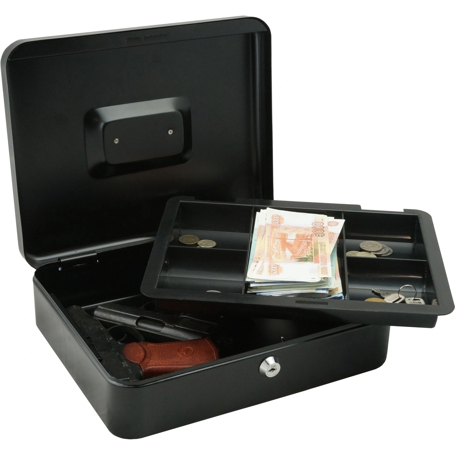 Кэшбокс Klesto, удобный переносной мини сейф для денег, который можно использовать как тайник. Легко спрятать в любой части квартиры или офиса. Прочная закрываемая на ключ переносная шкатулка с замком, для драгоценностей и денег. Для удобства транспортировки, предусмотрена удобная ручка. Для монет предусмотрен лоток для денег, выполненный из прочного пластика. Пластиковый лоток съёмный, под лотком место для размещения банкнот. Коробка с замком выполнена из прочного металла толщиной 0,6 мм. Переносная коробочка для хранения денег или драгоценностей — отличный презент маме, папе, брату, жене или мужу. Отличный детский сейф для денег, шкатулка для документов, ящик для медикаментов.
