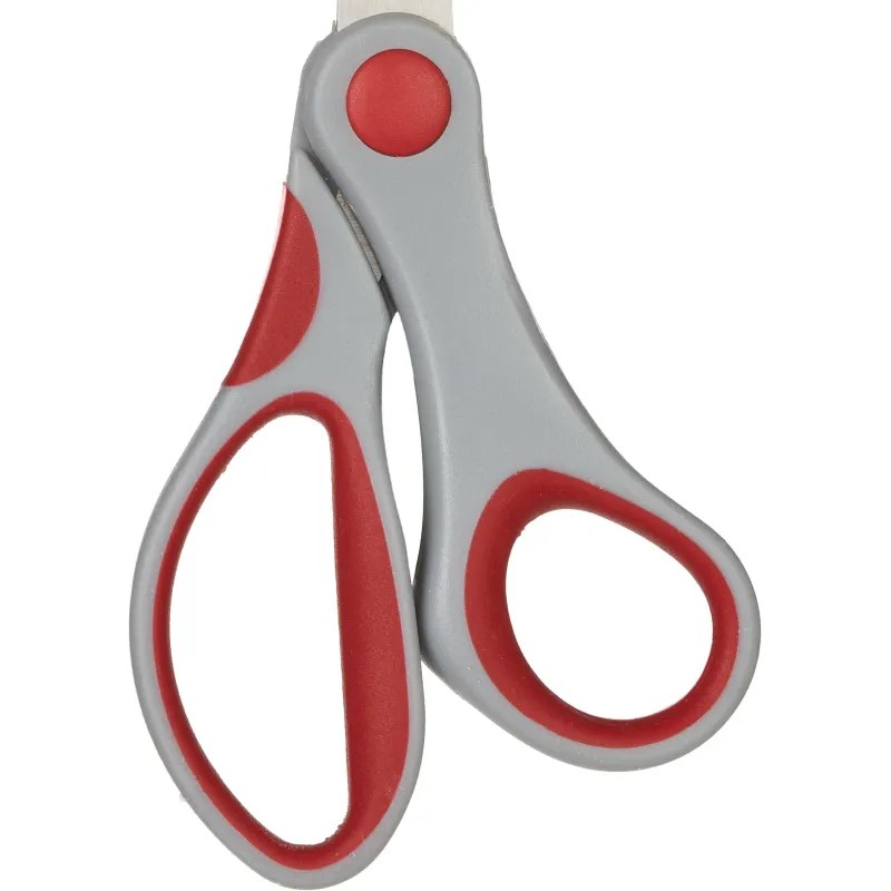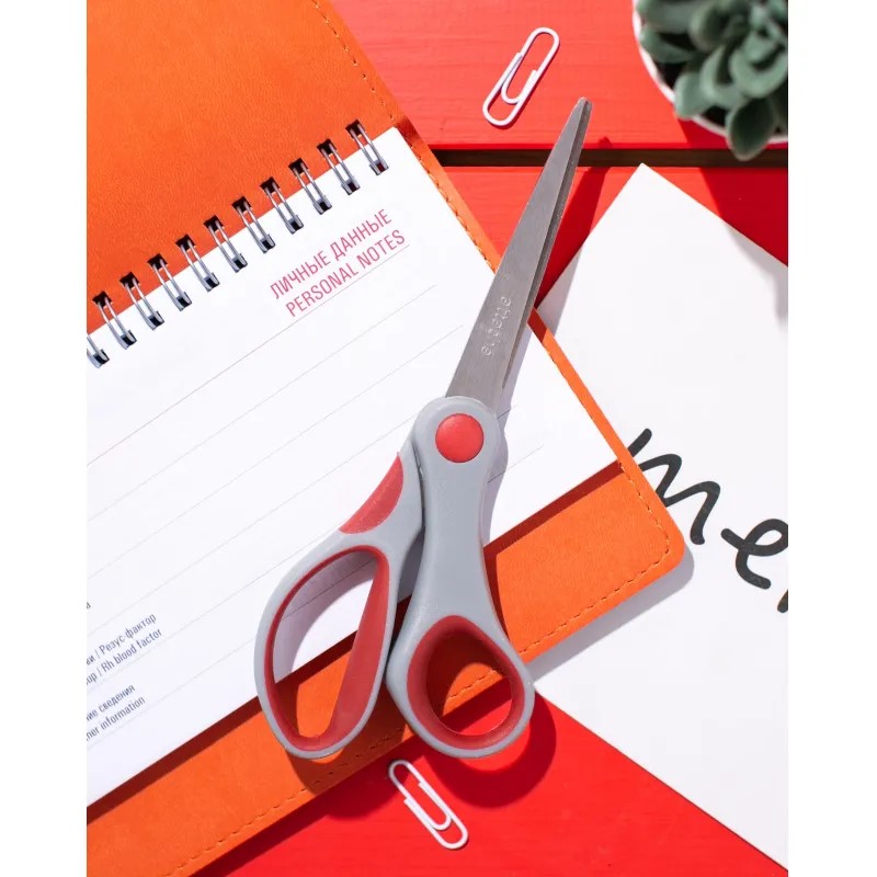 Элемент крепления обеспечивает плавную и мягкую работу лезвий. Двухсторонняя заточка лезвий. Длина ножниц — 18 см. Цвет ручек комбинированный — серый с красным.