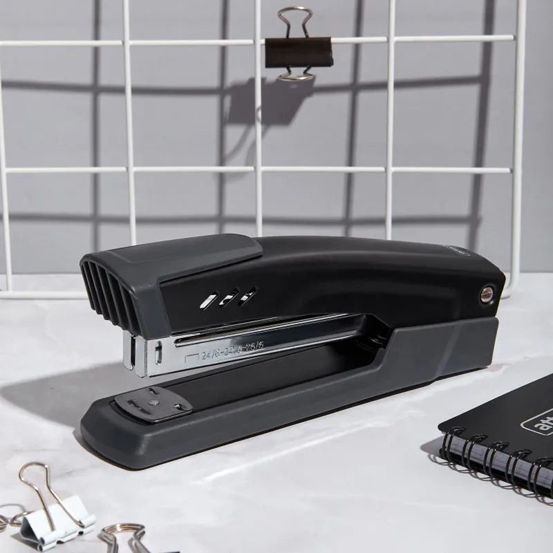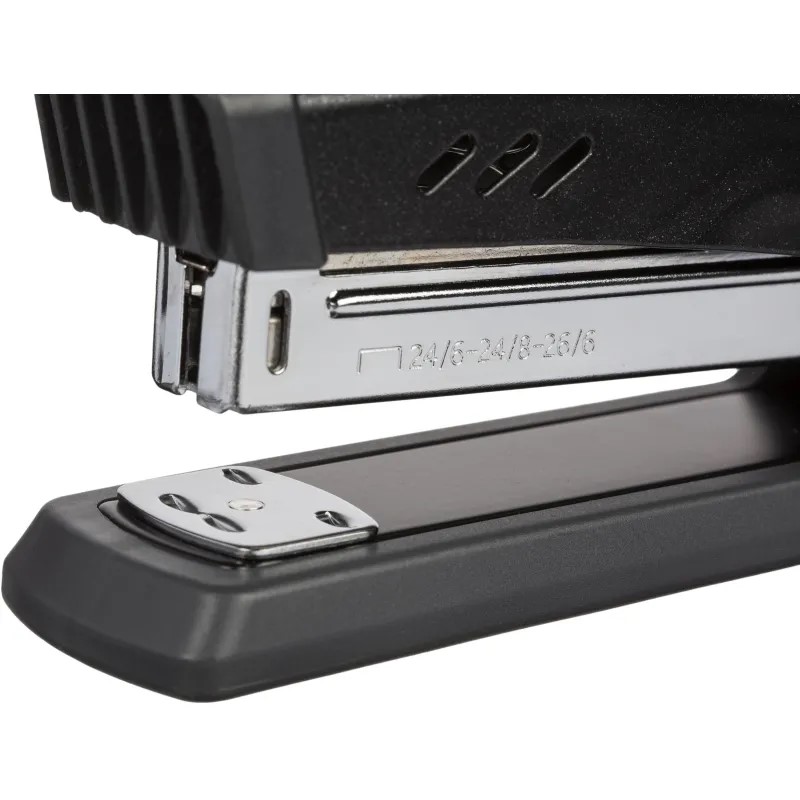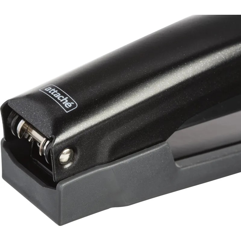 Степлер Attache Power одновременно сшивает до 50 листов плотностью 80 г/кв.м. Оснащен функцией закрытого и открытого сшивания. Глубина закладки бумаги — 80 мм (8 см). Корпус выполнен из металла черного цвета с пластиковыми вставками. Тип и размер используемых скоб: 24/6, 24/8, 26/6 Вместимость скоб: № 24/6, 24/8 — 100 штук, 26/6 — 150 штук.