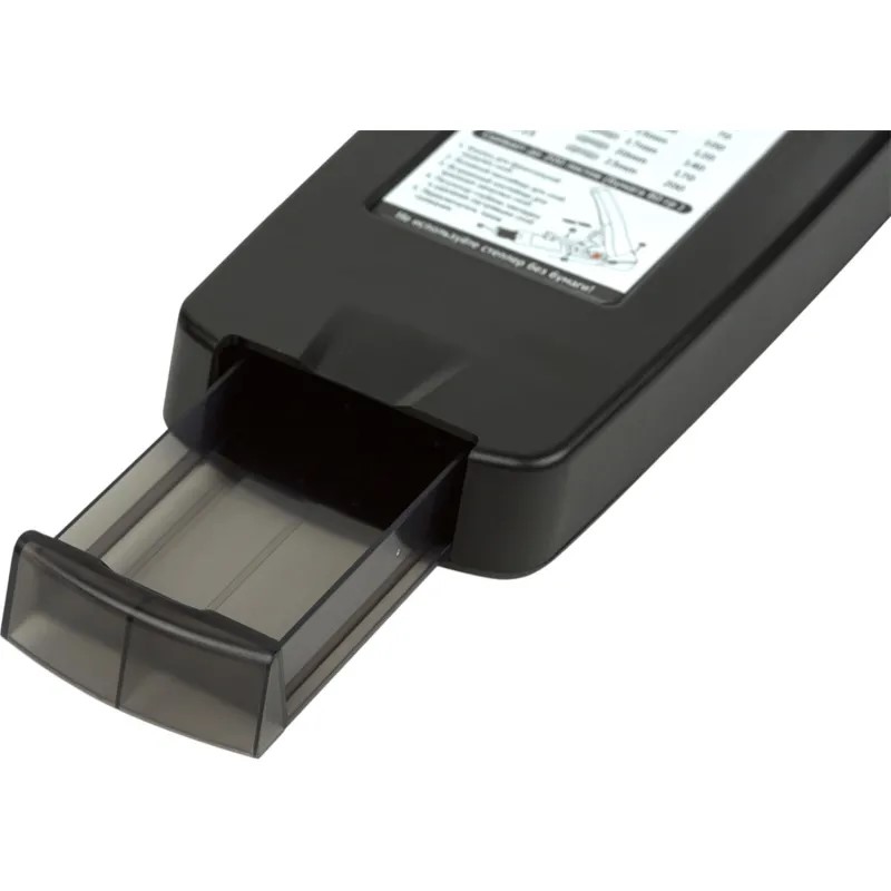 1. Уберите бумагу и, используя кнопку (1), извлеките оставшиеся скобы из контейнера (2).