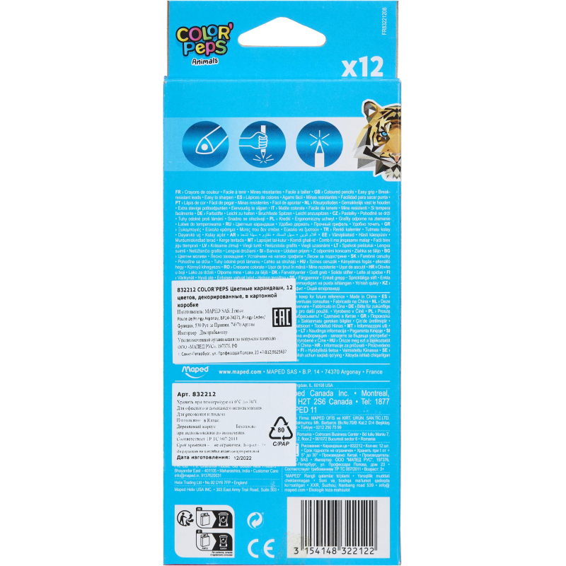 Карандаши цветные 12 цветов трёхгранные Maped COLOR'PEPS ANIMALS