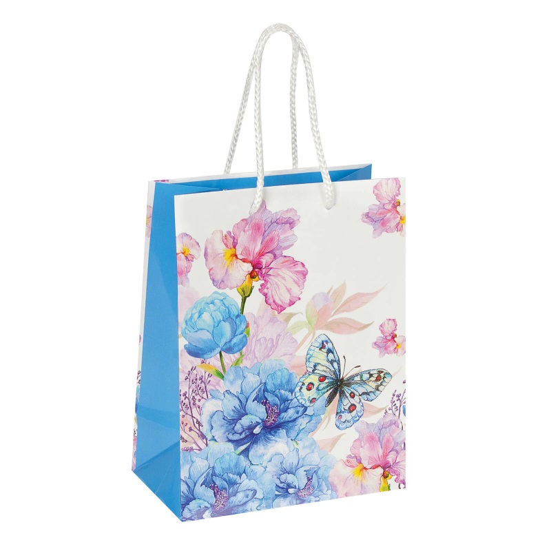 Изготовлен из ламинированной мелованной бумаги с веревочными ручками из полипропилена. Размер 17,8x9,8x22,9 см. Пакет выполнен в белых и голубых тонах с изображением бабочки и цветов.