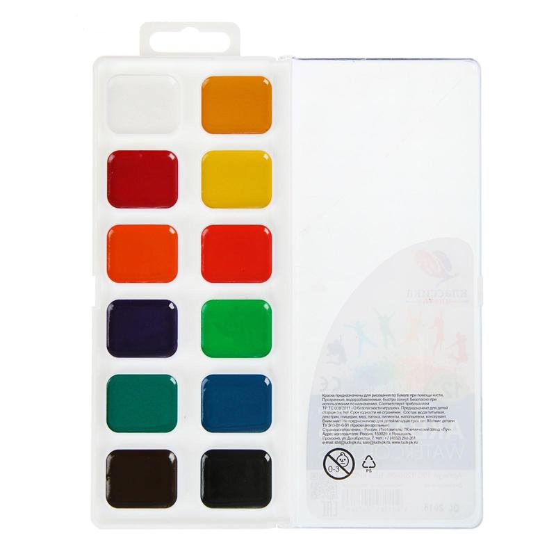 Акварельные краски предназначены для детского и художественного творчества. В футляре 12 цветов: белила, желтый, желтый темный, оранжевый, светло-рубиновый, изумрудно-зеленый, голубой, черный, коричневый, фиолетовый, светло-зеленый, алый.