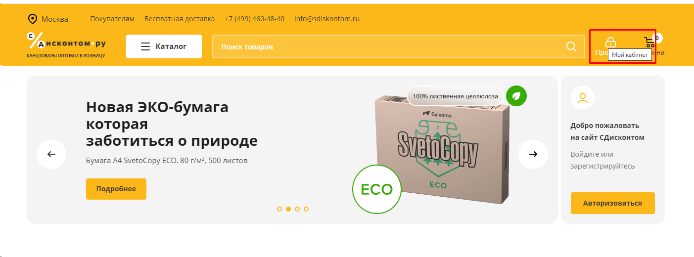 Также зарегистрироваться или авторизоваться на сайте «Сдисконтом.ру» можно наведя курсор на кнопку «Мой кабинет».