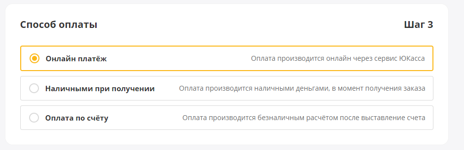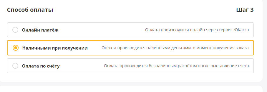 Вы можете оплатить заказ при получении: наличными — курьеру или в пункте выдачи