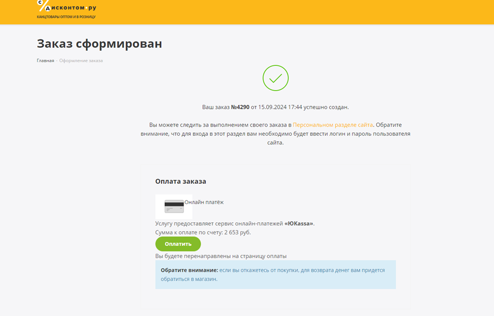 Заполните необходимые реквизиты и совершите платеж. С вашего лицевого счета будет списана сумма, равная стоимости заказа в интернет-магазине «Сдисконтом.ру».